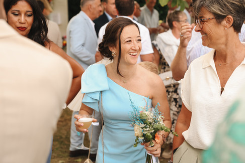 Après une sortie d'église digne des films hollywoodiens, direction le vin d'honneur où cocktails, aquarelliste et orchestre attendent nos invités ! Le cocktail commence, "Evidence Reception" régale les invités pendant que "labarmobile" créer des cocktails à l'image des mariés ! Les invités dansent et profitent, tout à été pensé pour que tout le monde passe une excellente journée ! Vient ensuite un moment que personne n'avait vu venir, mais dont beaucoup se souviendront. Pour clôturer le cocktail, Manon et Luca demandent à leur invités de se rassembler pour un petit discours, mercis, et larmes s'enchainent, quand Manon finit par faire son fameux lancer de bouquet ! Mais là, surprise, elle s'arrête, non, elle ne lancera pas le bouquet ! Elle se retourne et part en direction de sa belle sœur, surprise, celle ci accepte le bouquet et se retourne, son conjoint à déjà un genoux à terre : OUI ! Mais pour ces futurs mariés, c'est une autre histoire, revenons à Manon et Luca ! Il est temps pour les invités de rentrer en salle et il était temps, car une averse arrive ! Le moment idéal pour quelques photos de couple sous la pluie.